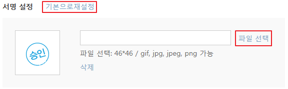 승인 결재 이미지는 사용자 PC에 저장해둔 이미지를 [파일 선택]을 클릭해 업로드하여 사용할 수 있습니다.