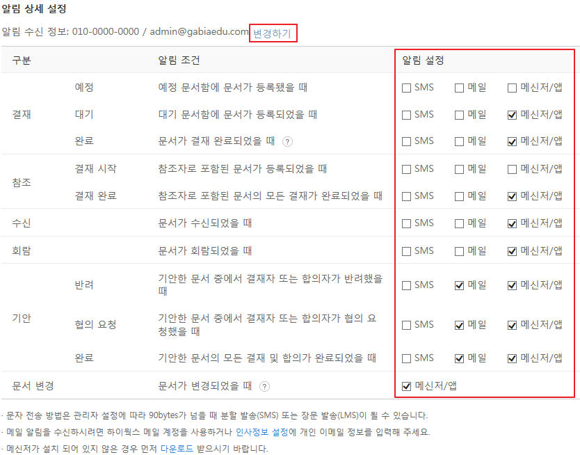 각 조건에 따라 SMS, 메일, 메신저로 알림을 받을지 설정할 수 있습니다.