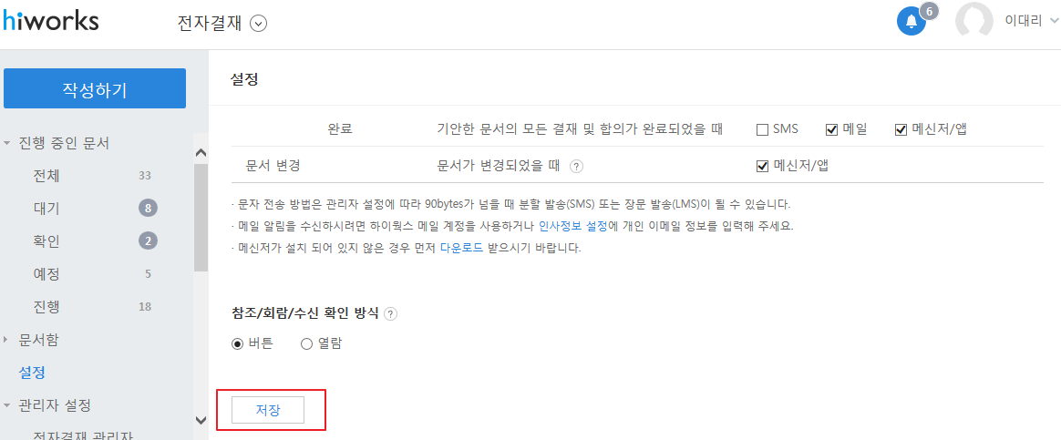 사용자는 쓰기, 읽기, 서명, 알림, 참조/회람/수신 확인 방식, 자주 쓰는 결재선을 직접 설정해 이용할 수 있으며 그 방법은 아래와 같습니다.