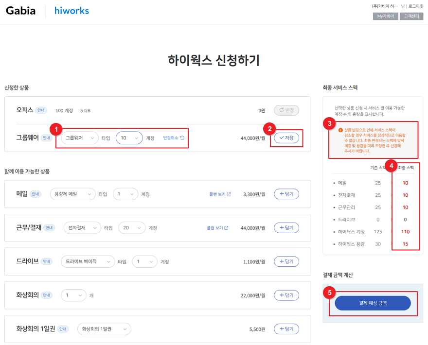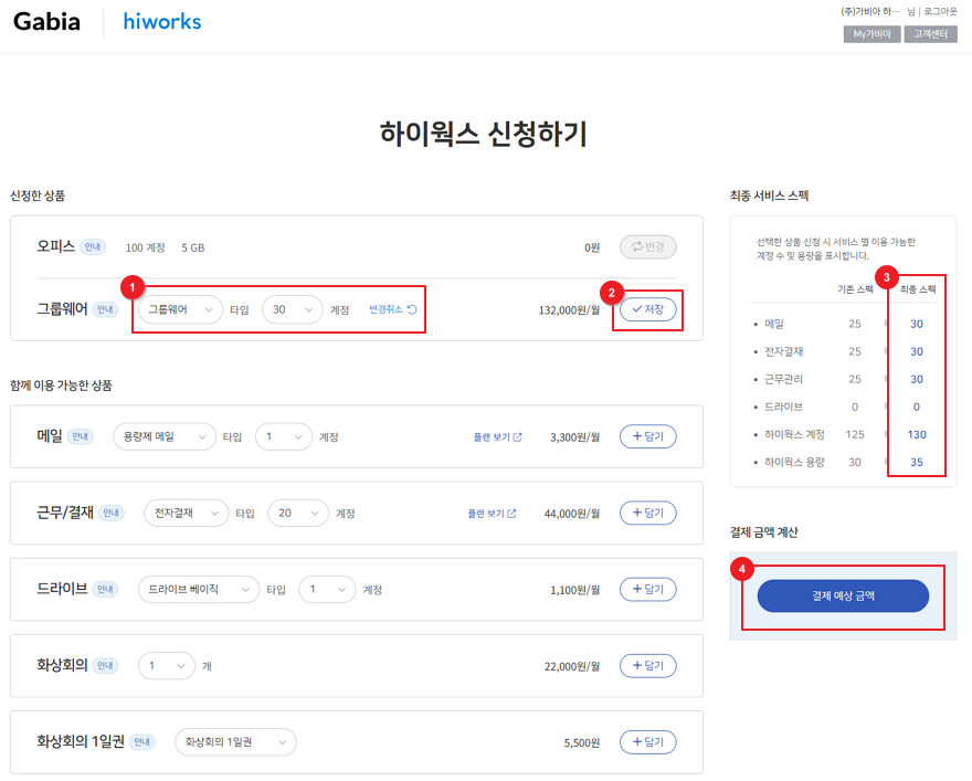 1) 추가할 계정을 선택해 저장하고, 최종 서비스 스펙을 확인한 후 [결제 예상 금액]을 클릭합니다.