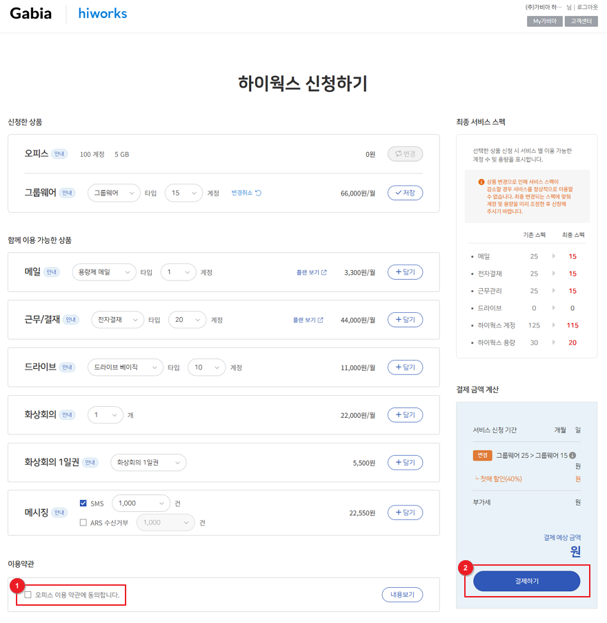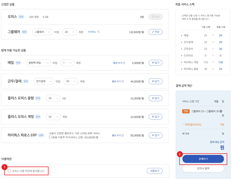 8-1. 현재 상품에 계정을 추가하는 경우 (예. 그룹웨어 25 계정 -> 그룹웨어 30 계정)