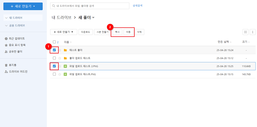 3. 복사 혹은 이동하고자 하는 파일들을 체크박스 선택한 후 [복사], [이동] 버튼을 클릭합니다.
