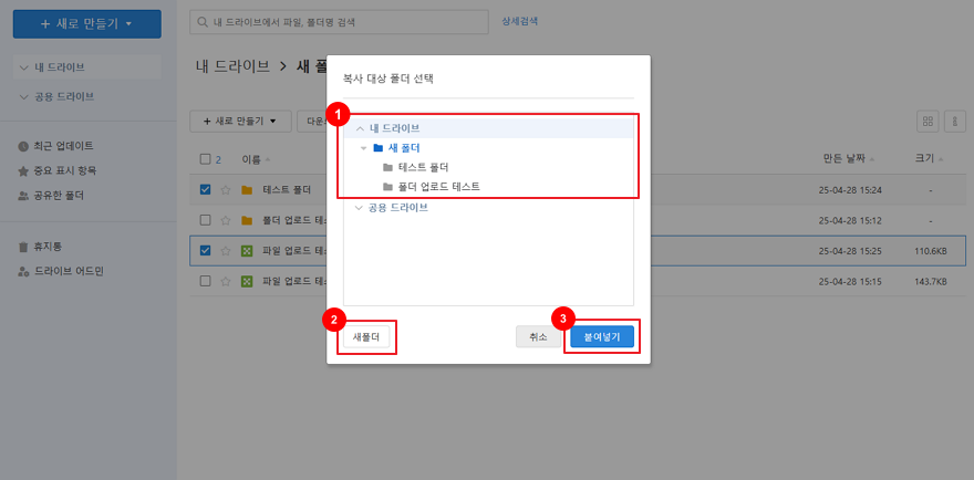 하이웍스 드라이브 솔루션에서 업로드한 파일을 복사/이동하는 방법은 다음과 같습니다.