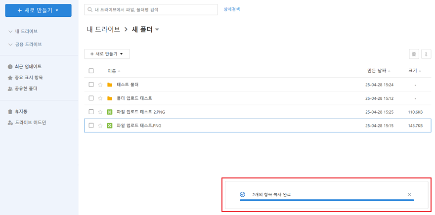 5. [복사] 혹은 [이동]이 완료되면 아래와 같이 완료 체크가 표시되며, 해당 목록에서 확인할 수 있습니다.