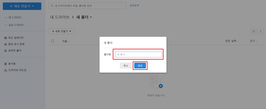 4. 새 폴더 생성 팝업에서 폴더명 칸에 생성하려는 폴더 이름을 입력하고, [생성]을 클릭하거나 'Enter'키를 누르면