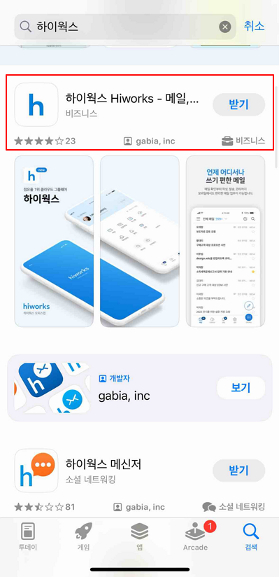 3. [받기]를 클릭해 하이웍스 앱을 다운로드합니다.