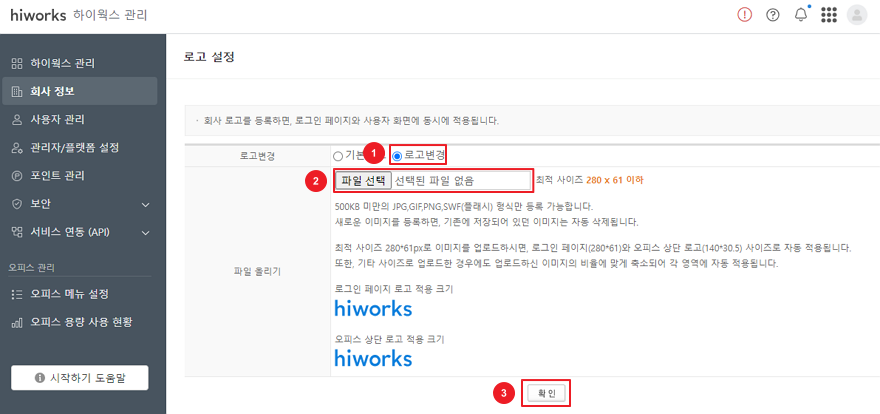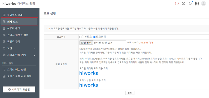 4. 하이웍스 기본 로고를 사내 로고로 변경을 원하는 경우, [로고변경]을 선택해 사용할 이미지 파일을 올린 후 [확인]을 클릭합니다.