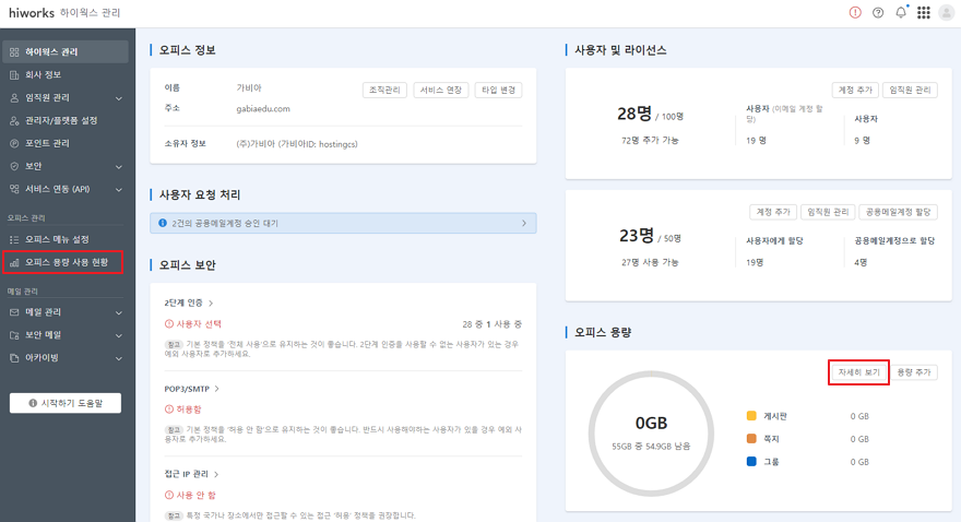 3. [하이웍스 관리 > 오피스 관리 > 오피스 용량 사용 현황] 또는 우측 오피스 용량의 [자세히 보기]를 클릭합니다.