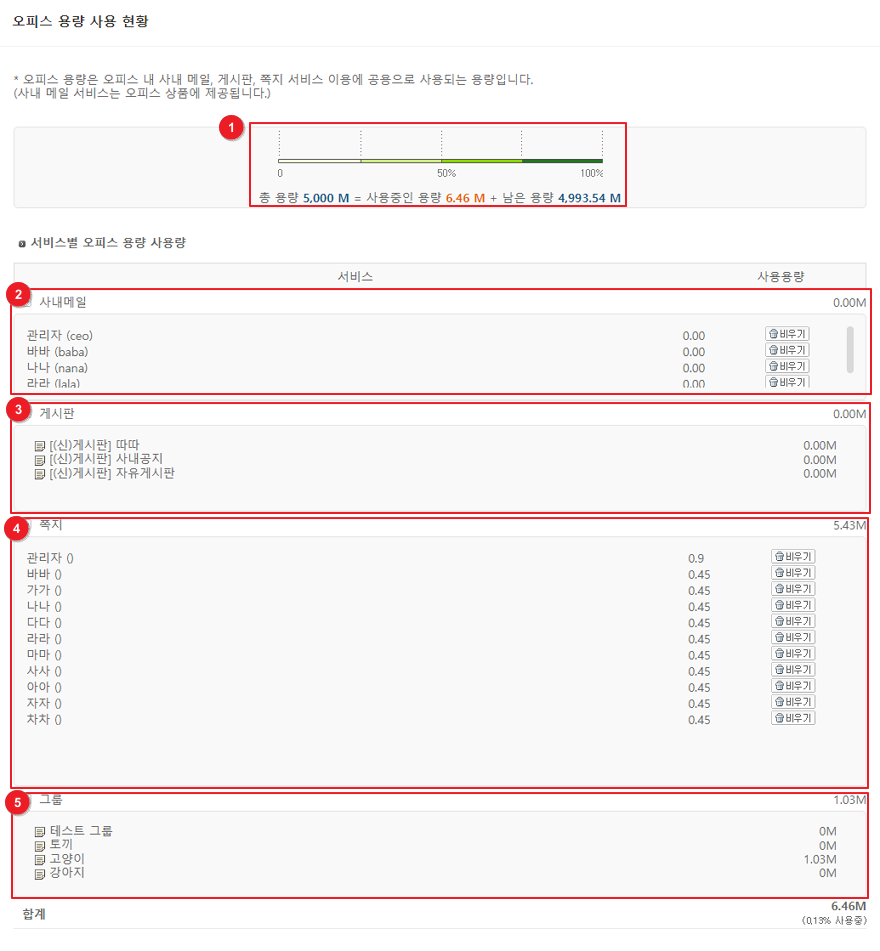 오피스 용량은 사내 메일, 게시판, 하이웍스 메신저의 쪽지, 그룹에서 사용하는 용량입니다.