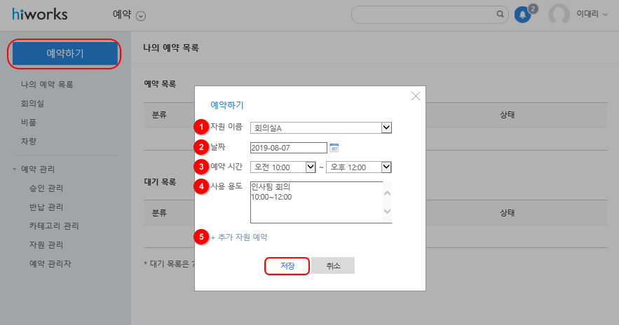 ⑤ [+ 추가 자원 예약]을 클릭하면 추가로 예약할 복수의 자원을 선택할 수 있습니다.