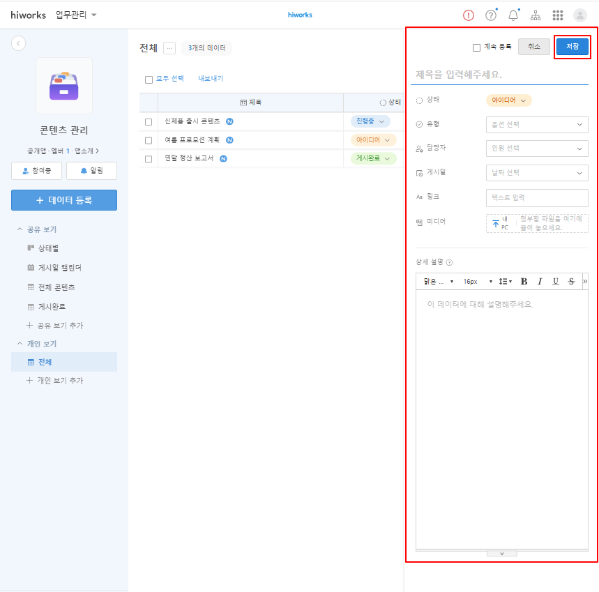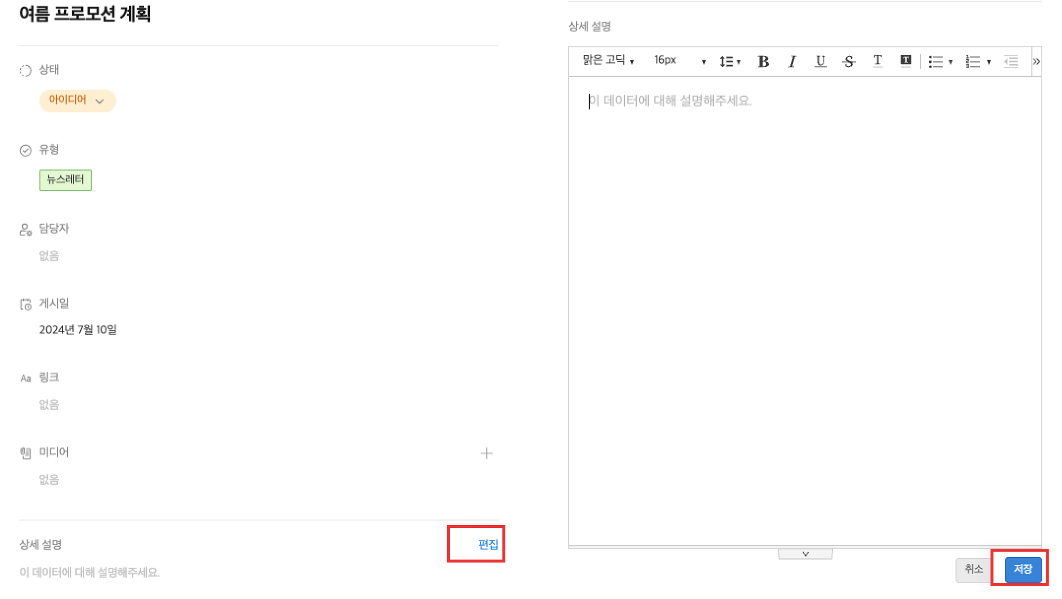 해당 데이터에 편집권한이 있어야지 상세 설명도 편집할 수 있습니다. |