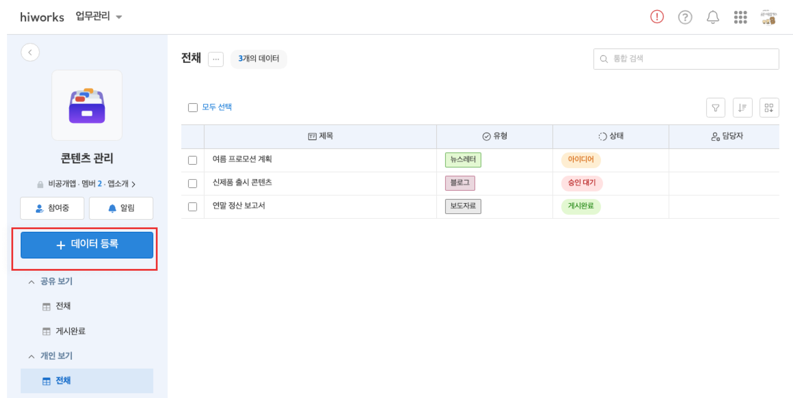 • 데이터 편집은 앱 관리자가 설정한 편집 권한에 따라서 등록자만 혹은 모든 멤버가 편집할 수 있습니다. |