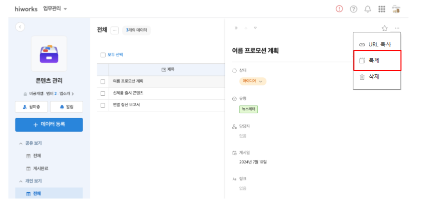 복제는 해당 앱의 멤버인 경우에만 가능하며, 같은 앱 내에서만 복제할 수 있습니다. |