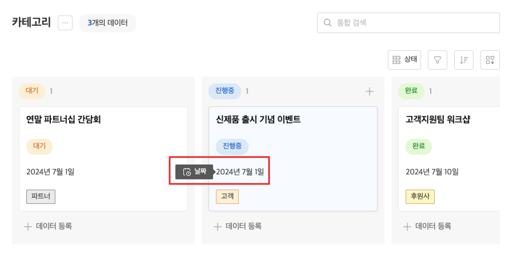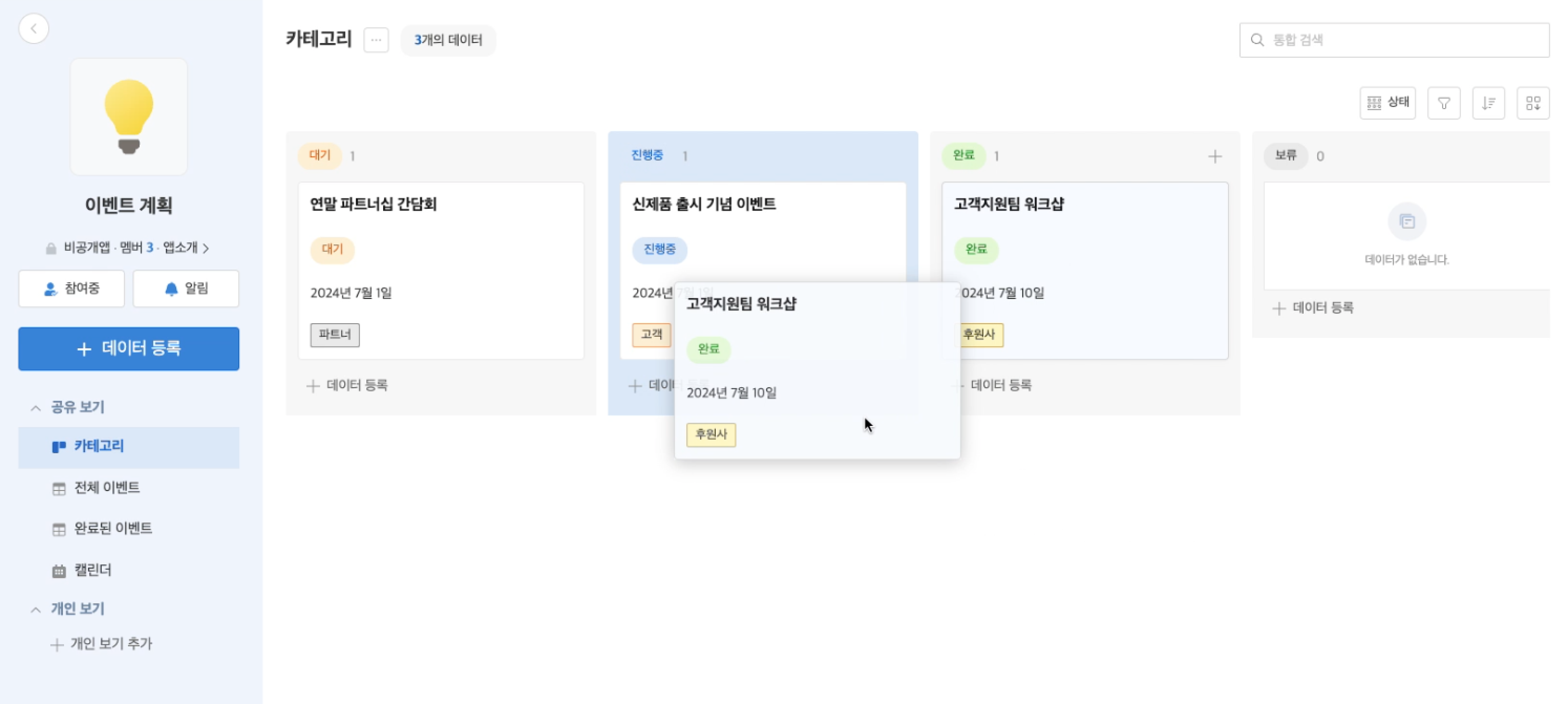 칸반 보기는 앱 LNB에서 생성할 수 있으며, 자세한 내용은 보기 사용하기 페이지를 참고해주세요.
