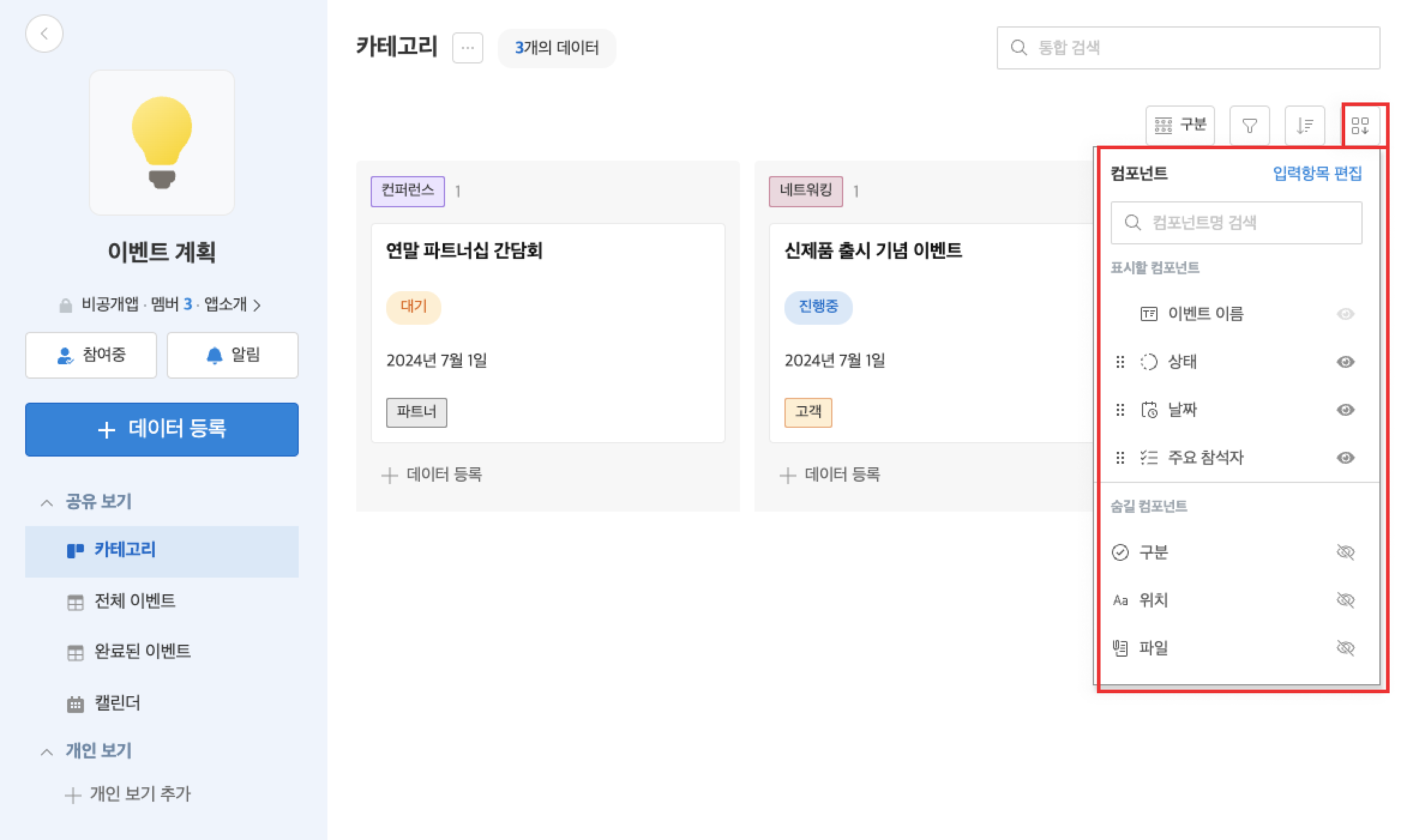 • [컴포넌트] 버튼은 앱의 멤버에게만 노출됩니다. |