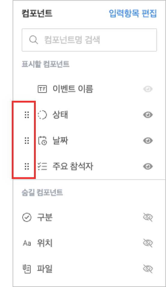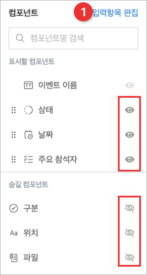 2. 표시할 컴포넌트와 숨길 컴포넌트에서 각 컴포넌트 우측의 [눈] 아이콘을 클릭하여 표시 여부를 설정합니다.