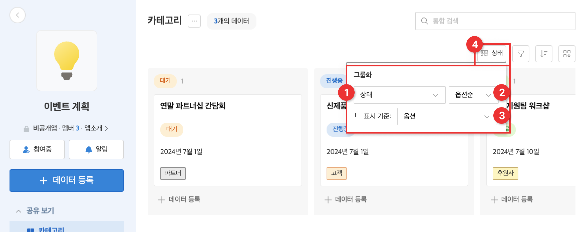③ 표시 기준은 그룹화 기준을 '상태' 컴포넌트로 설정한 경우에만 표시되며, 옵션과 카테고리 중에서 선택할 수 있습니다.