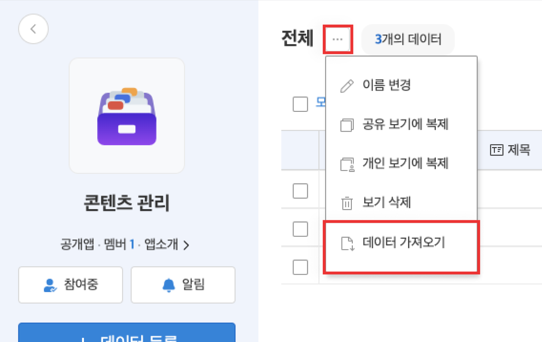 4. 보기 이름 우측의 [더보기] 버튼을 클릭 후, [데이터 가져오기]를 클릭하세요