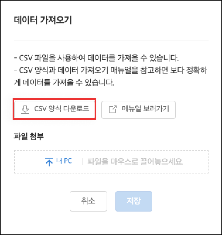 5. [CSV 양식 다운로드]를 클릭하여 양식을 내려받은 뒤, 각 컴포넌트 설명에 맞게 내용을 입력합니다.