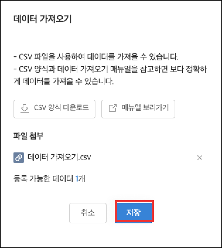 6. 입력한 파일을 첨부하고, [저장]을 클릭합니다.