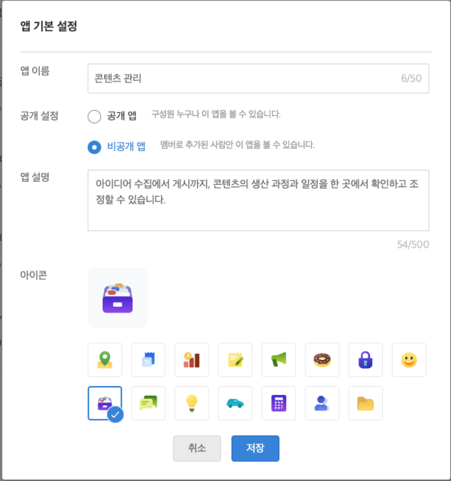업무 앱의 이름과 공개 설정, 설명, 아이콘을 변경할 수 있습니다. 내용 작성 후 [저장]을 클릭하면 앱 정보가 변경됩니다.