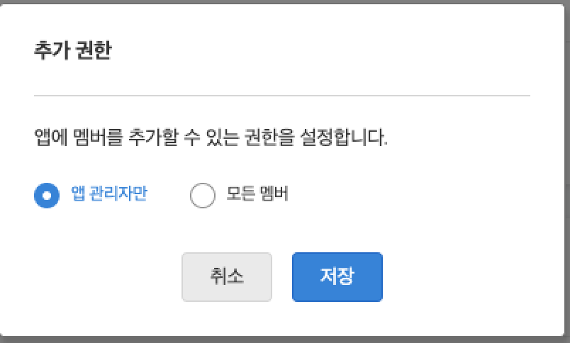 앱에 멤버를 추가할 수 있는 권한을 ‘앱 관리자만'과 ‘모든 멤버'로 설정할 수 있습니다.