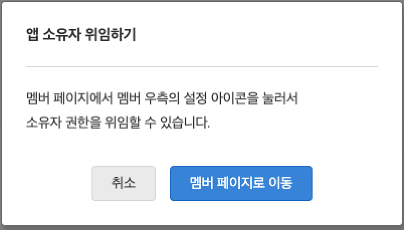 • 해당 앱의 멤버가 아닌 인원에게 앱 소유권을 위임할 수 있으며, 위임하는 순간 그 인원은 앱의 멤버로도 참여하게 됩니다. |
