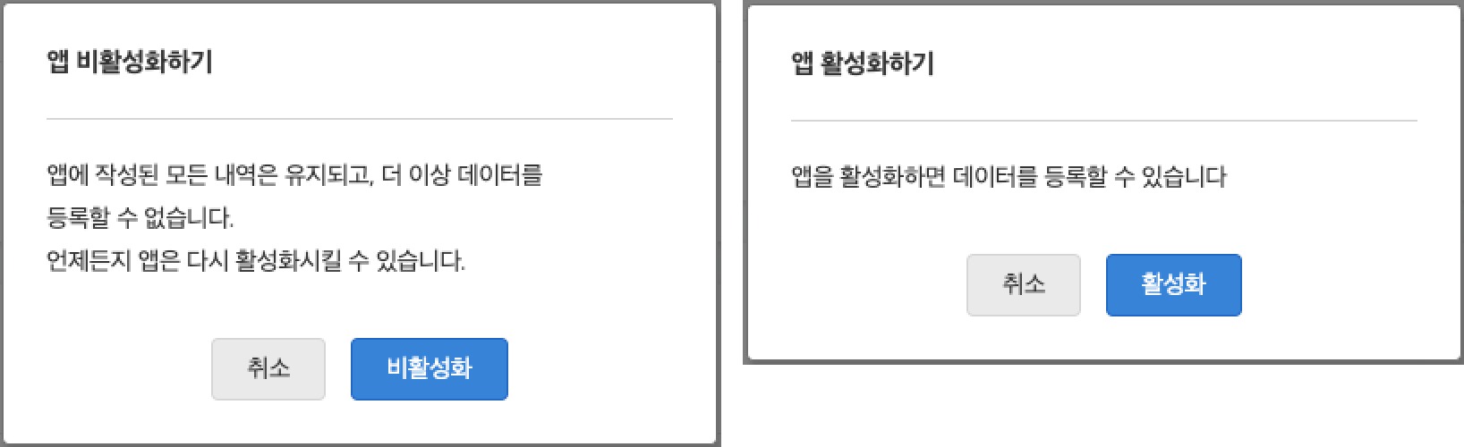 • 더 이상 업무 앱을 사용하지 않지만 업무 앱에 작성된 히스토리를 유지하고 싶을 때 업무 앱 비활성화 기능을 사용합니다. |