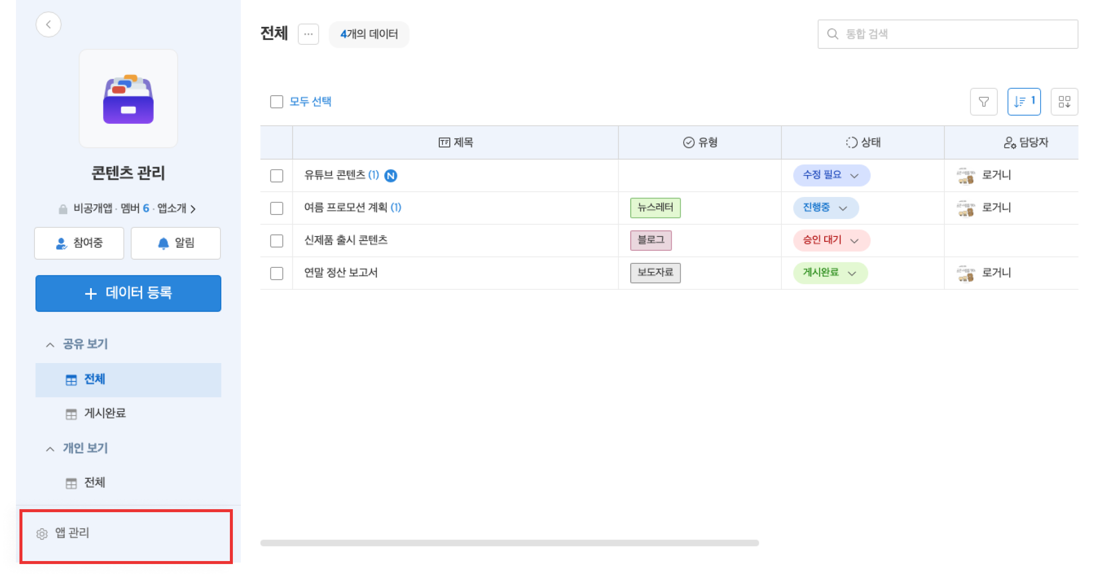 4. 업무 앱 소유자/관리자 계정으로 접속한 후, 업무 앱 페이지에서 [앱 관리]를 클릭합니다.
