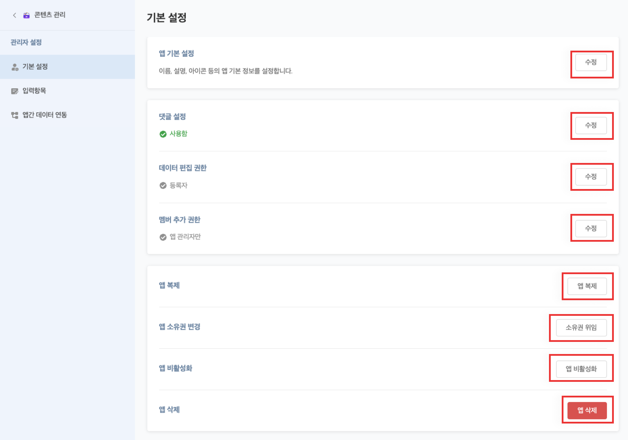 5. 앱 관리자 페이지에서 메뉴 우측 버튼을 클릭하여 원하는 작업을 진행합니다.
