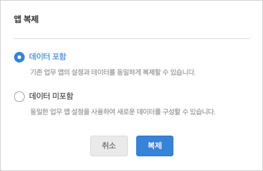 ② 데이터 미포함: 동일한 업무 앱 설정을 사용하여 새로운 데이터를 구성할 수 있습니다.