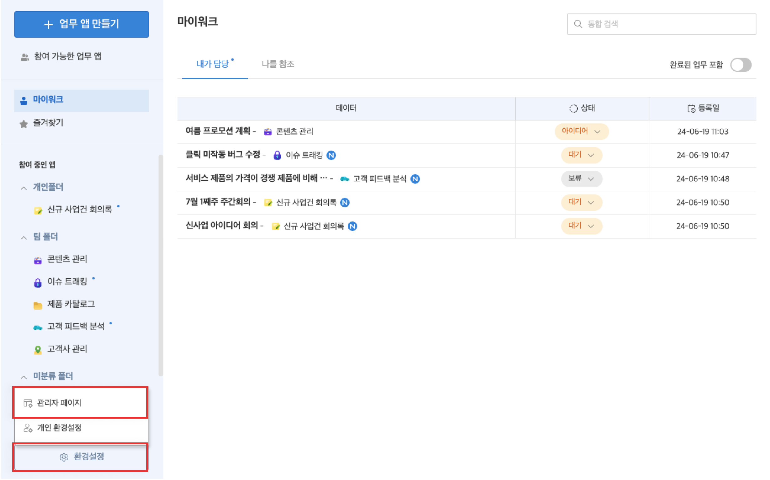 3. 업무관리 페이지에서 [환경설정]을 클릭 후, [관리자 페이지]를 클릭합니다.