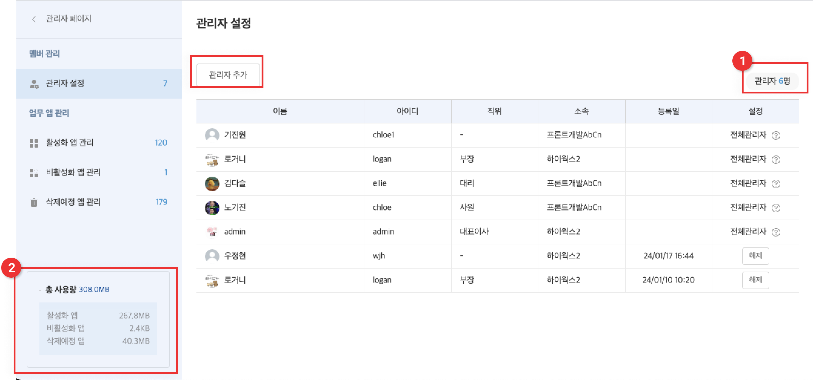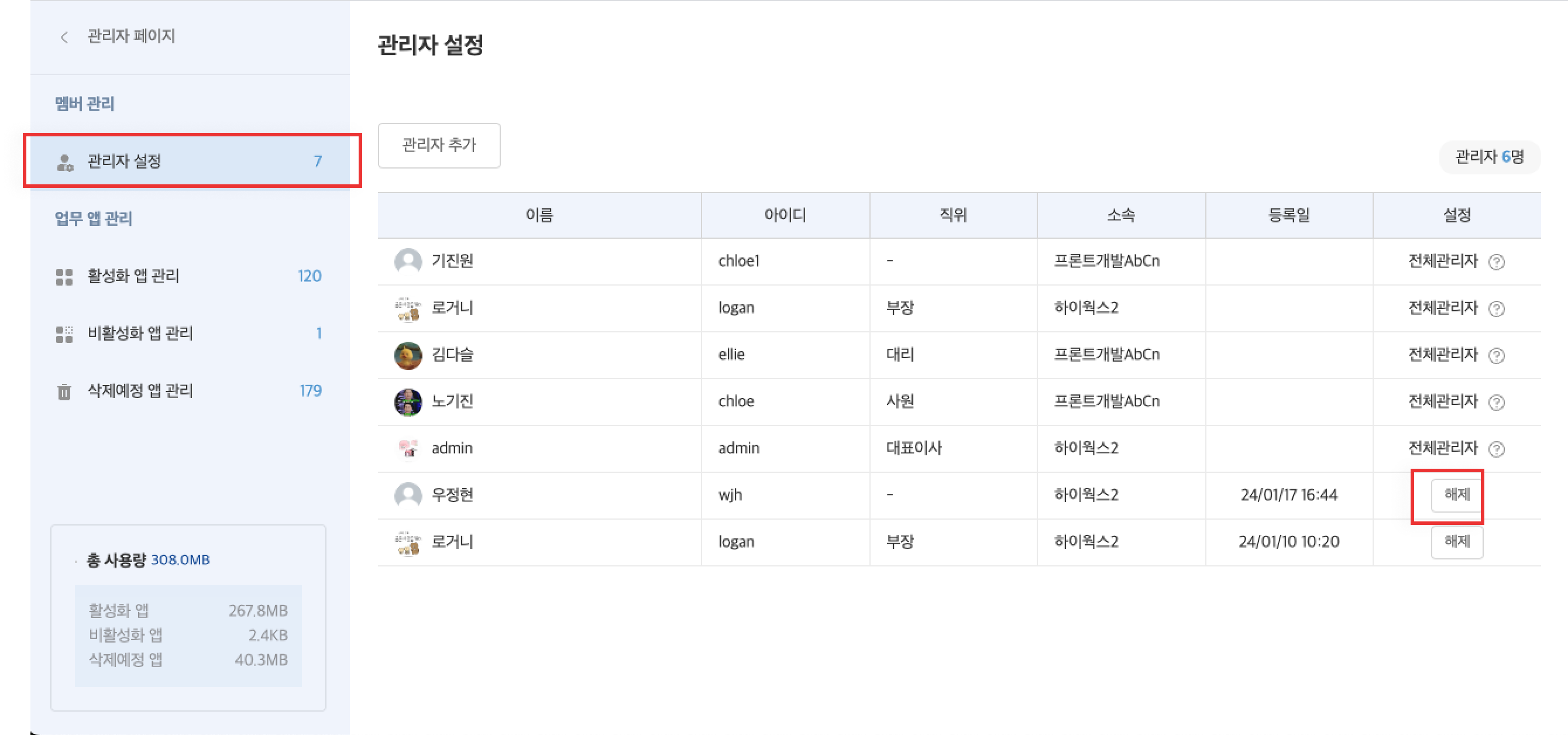 1. 관리자 설정 페이지에서 관리자 권한을 해제할 멤버의 [해제]를 클릭합니다.