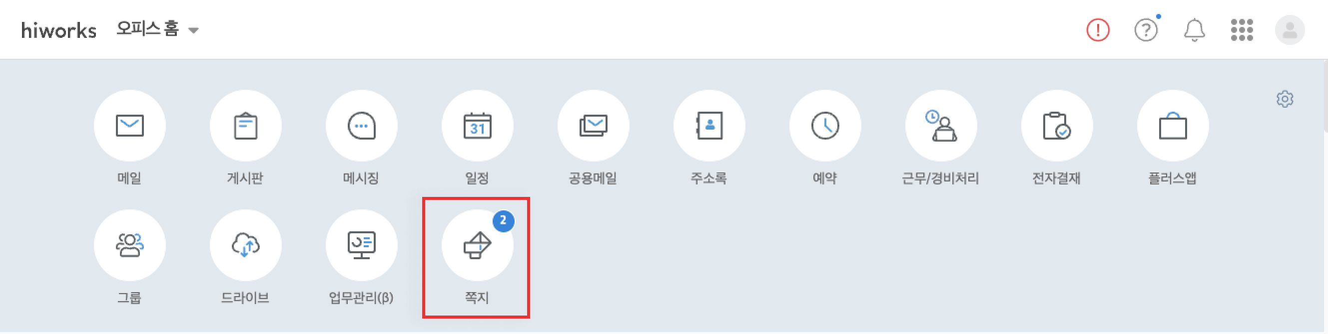 2. 로그인 후 오피스 홈에서 [쪽지]를 클릭합니다.
