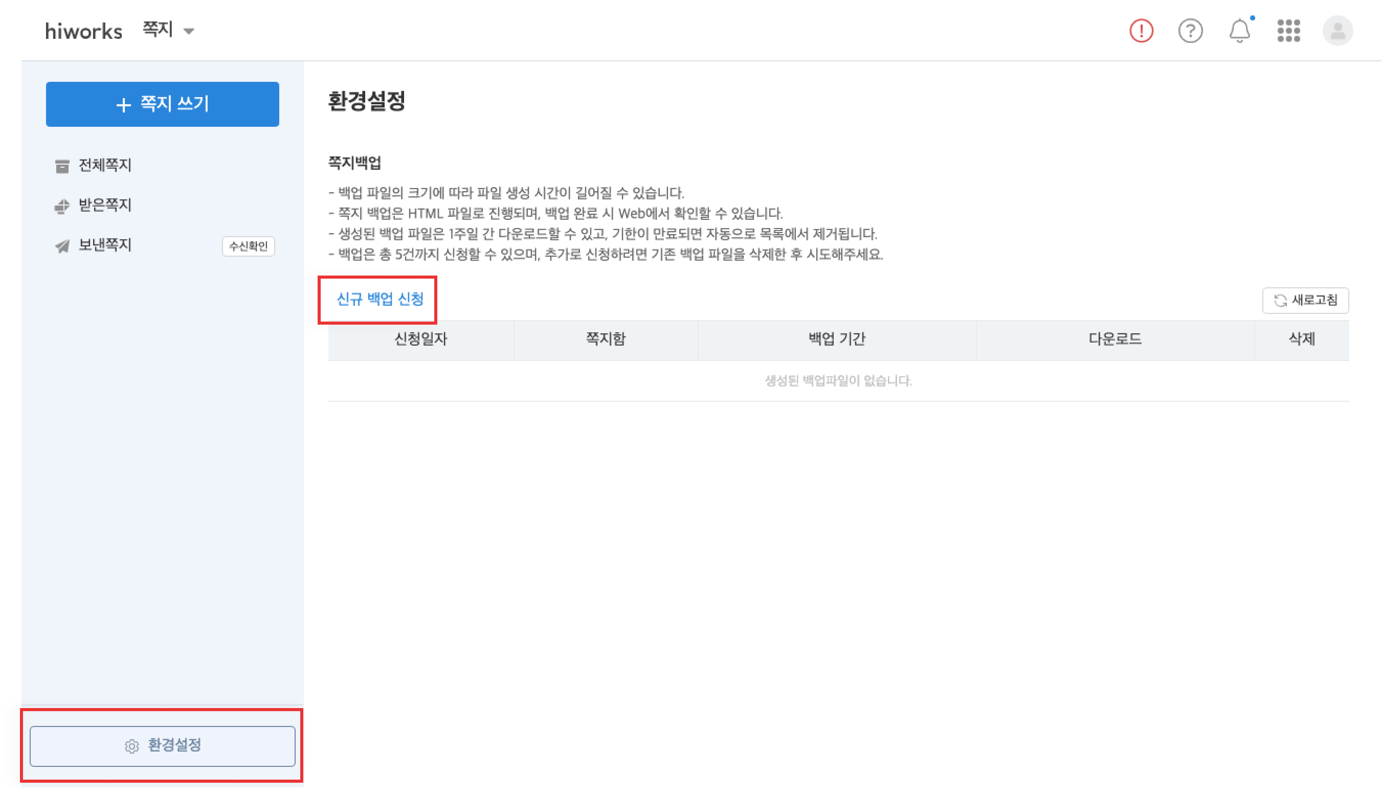 3. [환경설정]을 클릭한 뒤 [신규 백업 신청]을 클릭합니다.