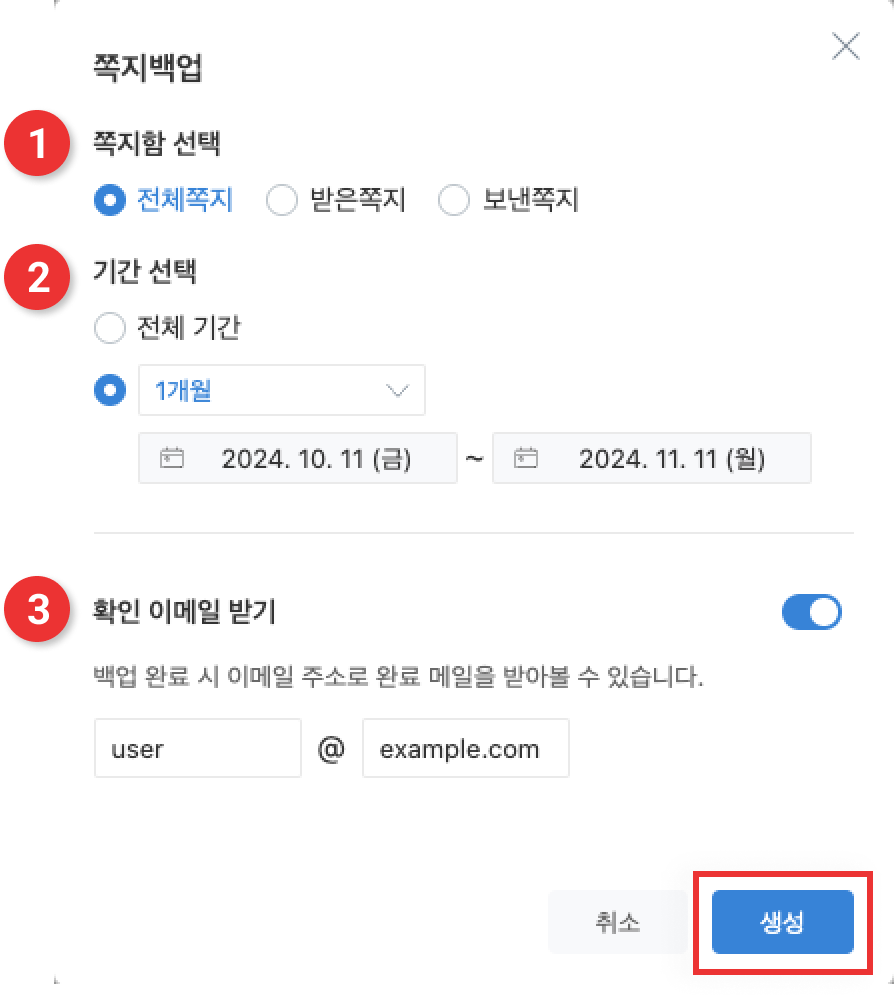 4. 백업이 필요한 쪽지함과 백업할 기간, 알림 받을 메일 주소를 확인하고 [생성]을 클릭합니다.