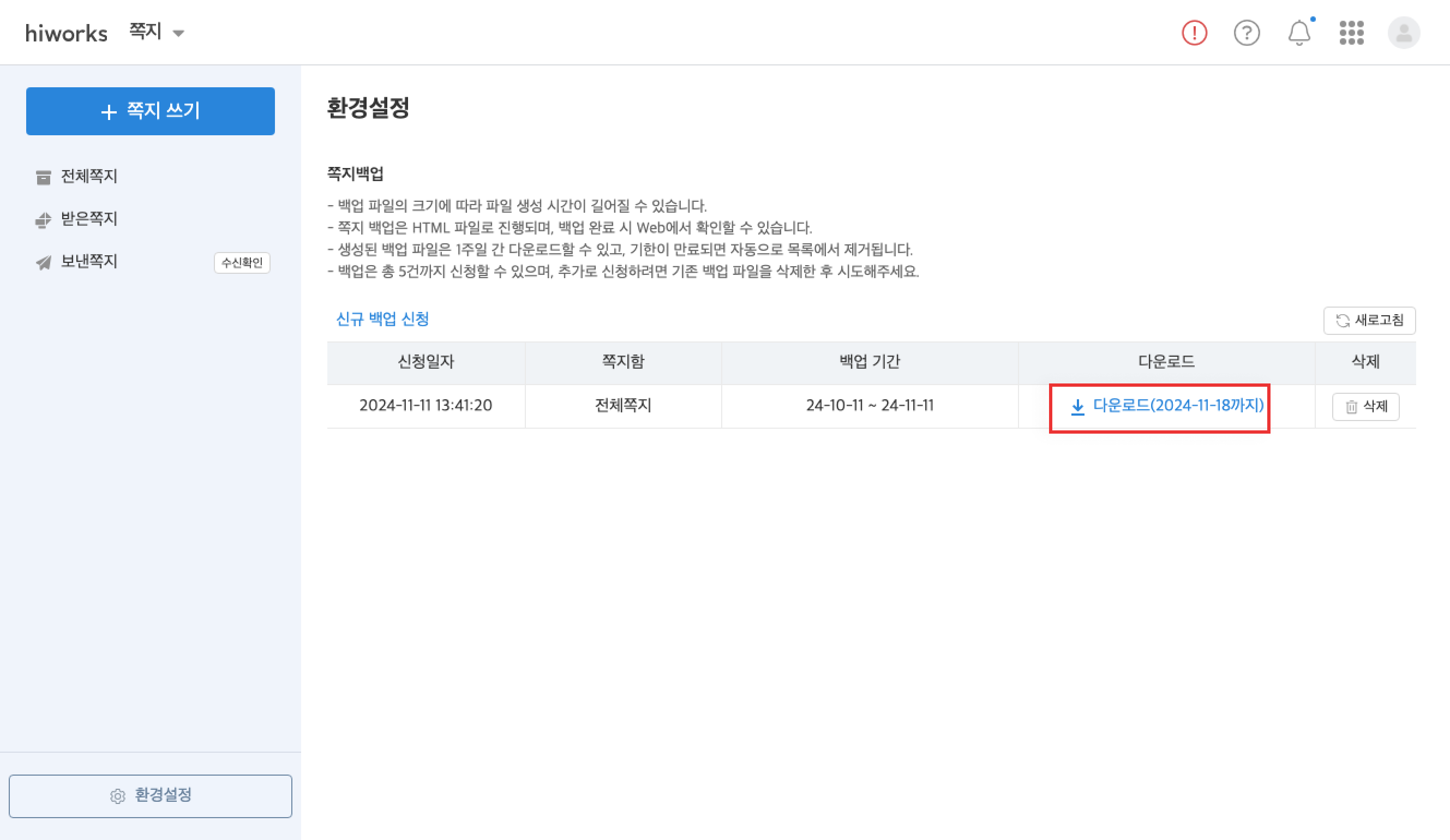 • 쪽지 백업은 HTML 파일로 진행되며, 백업 완료 시 웹에서 확인할 수 있습니다.(첨부파일 포함되어 백업이 진행됩니다.) • 백업된 쪽지가 많을 경우, 다운로드 파일을 나누어 생성합니다. • 백업 파일 생성은 파일 크기에 따라 생성 시간이 길어질 수 있으며, 최대 24시간이 소요될 수 있습니다. • 백업 파일 다운로드 준비가 완료되면 입력한 메일 주소로 안내 메일이 발송됩니다. • 해당 백업 파일 생성 중 화면을 닫아도 백업 파일은 계속해서 생성됩니다. |