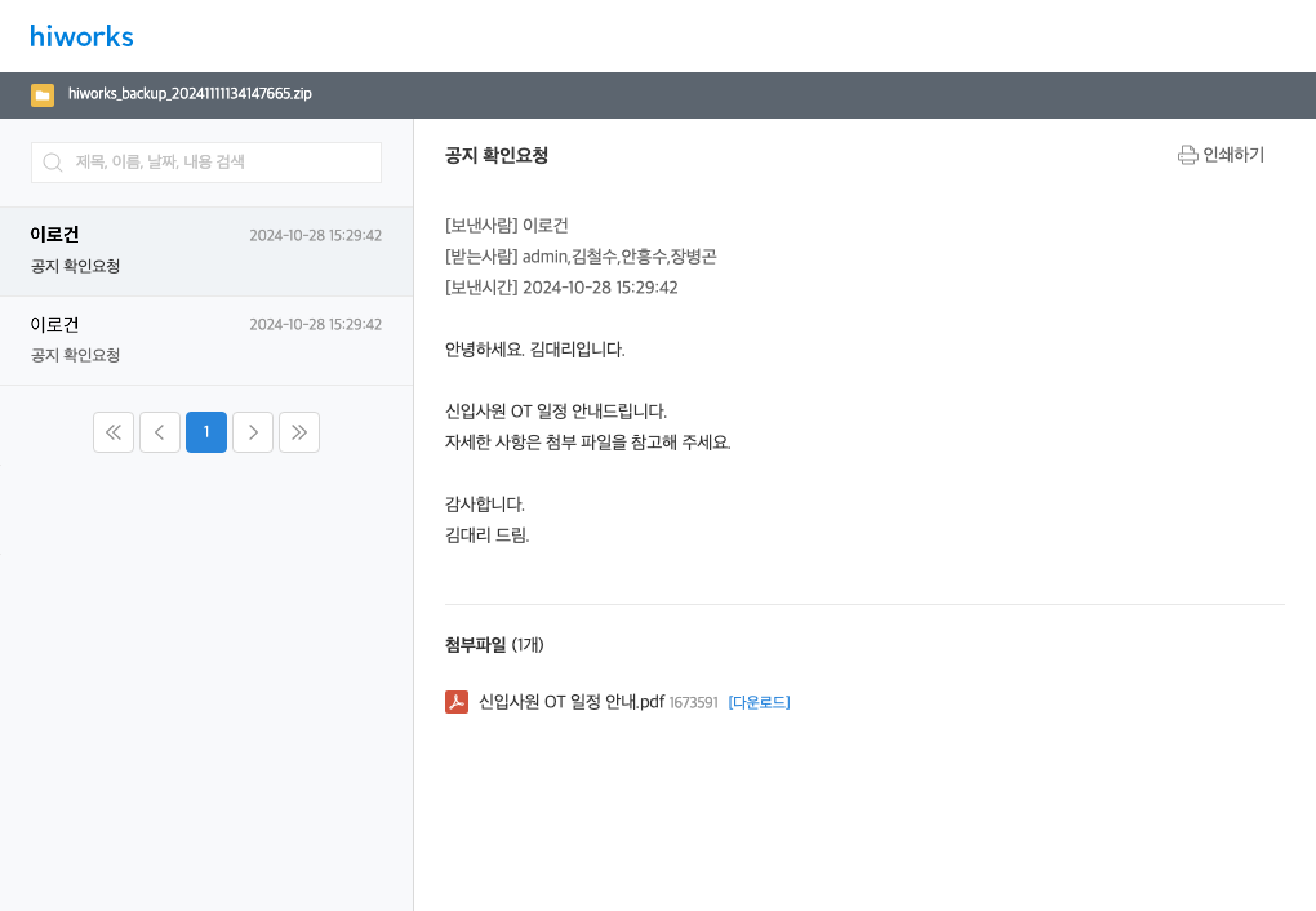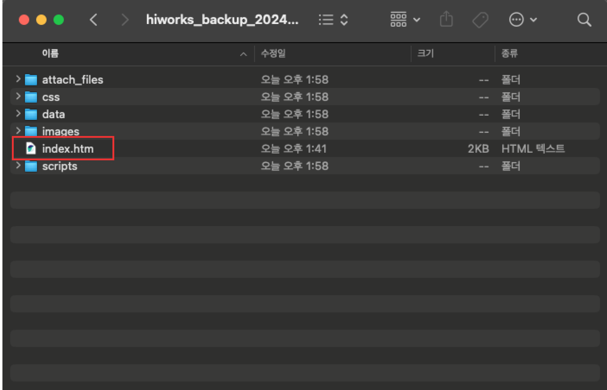 6. 백업 파일은 압축 형태의 ZIP 파일 확장자로 저장됩니다. 압축 해제 후 index 파일을 열면 웹 브라우저에서 쪽지 목록과 내용을 확인할 수 있습니다.