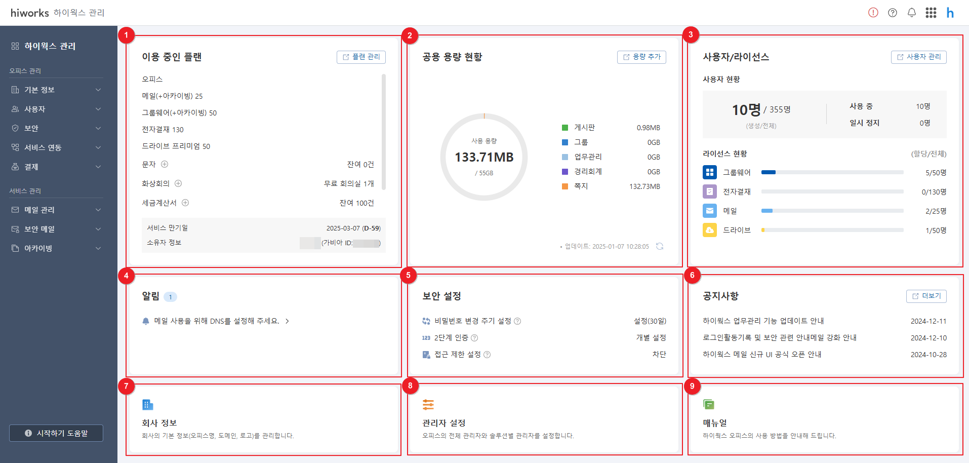 3. 하이웍스 관리 대시보드 기능은 아래와 같습니다.
