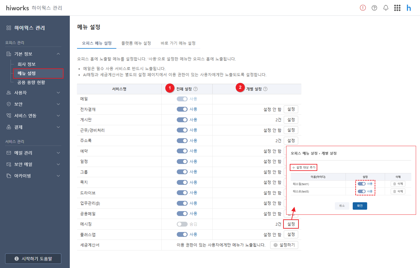 ① 전체 설정: 오피스 내 사용자 전체가 사용할 서비스는 [사용]으로 설정, 전체 사용하지 않을 서비스는 [숨김]으로 설정합니다.