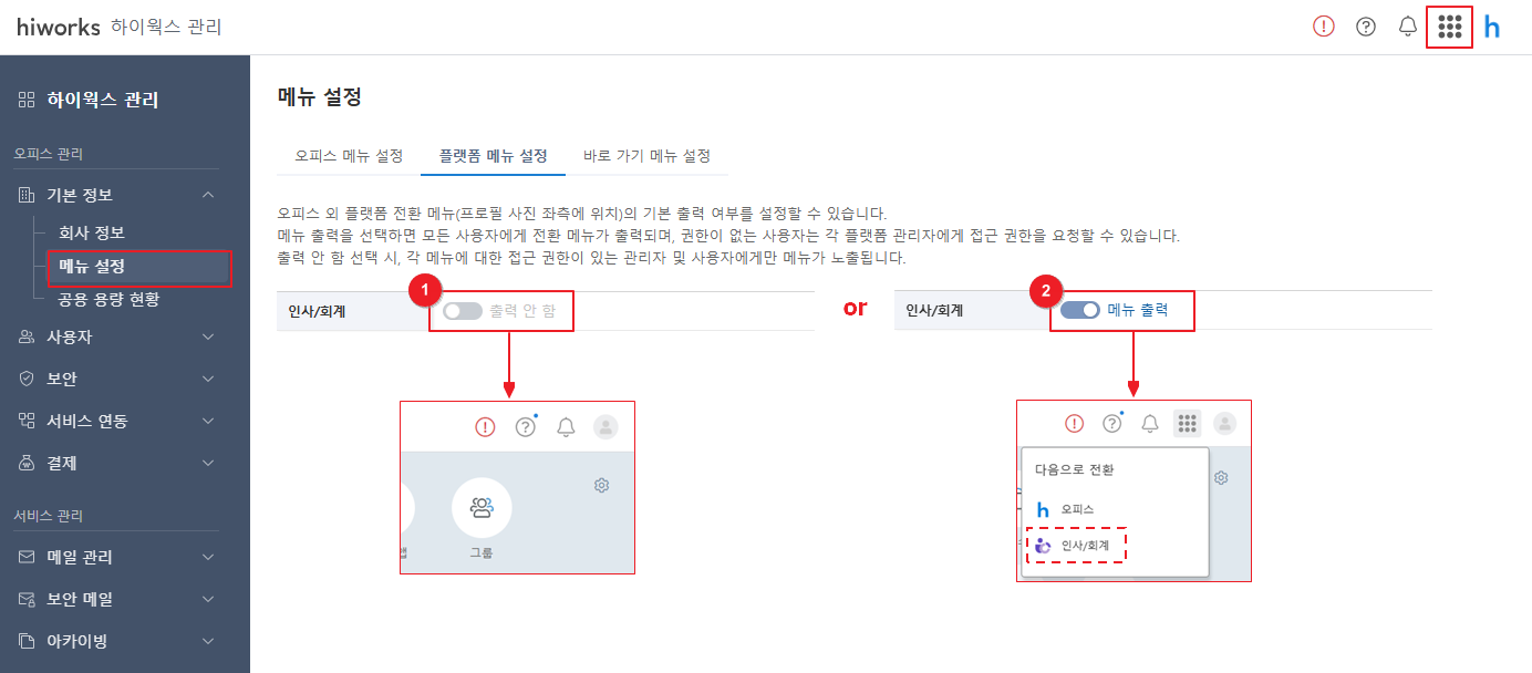 ② 인사/회계 '메뉴 출력': 인사/회계에 대한 접근 권한이 없더라도 플랫폼 전환 버튼이 출력됩니다.