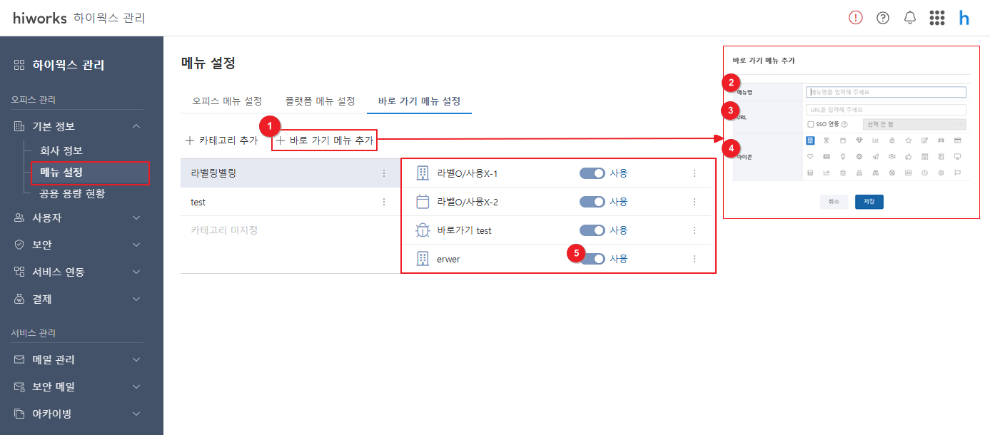 (2) [+ 바로 가기 메뉴 추가] 을 클릭하여 바로 가기 메뉴를 추가할 수 있습니다.