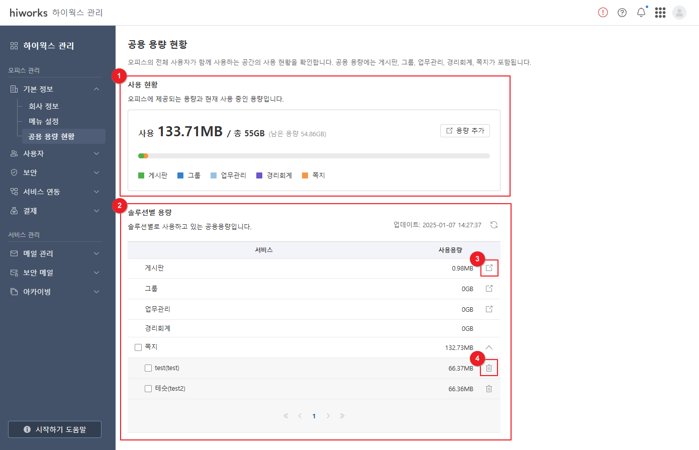 공용 용량에는 게시판, 그룹, 업무관리, 경리회계, 쪽지가 포함됩니다.