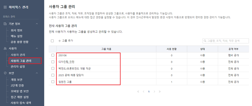 - '전체 사용자 공개'로 설정하면, 오피스의 전체 사용자가 해당 그룹을 조회하고 사용할 수 있습니다.