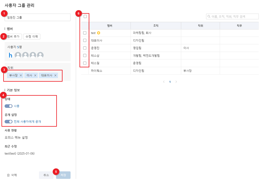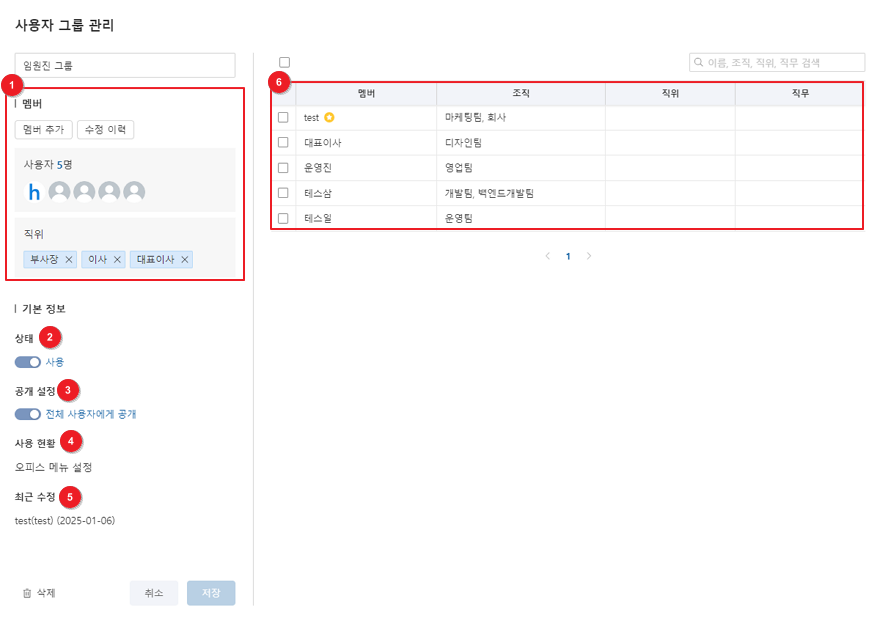 ⑥ 해당 사용자 그룹에 속한 멤버의 이름, 조직, 직위, 직무를 표시합니다. ★ 아이콘은 조직장을 의미합니다.