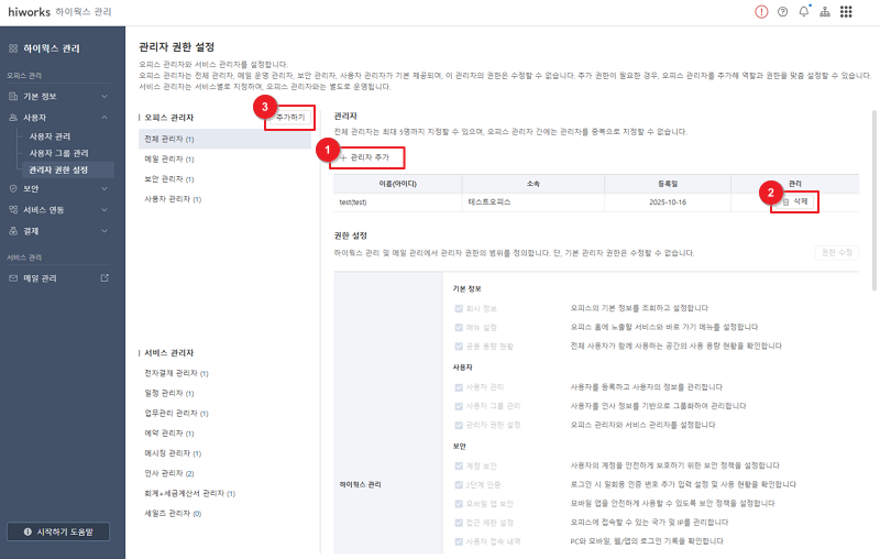 관리자 권한 설정에서는 오피스의 전체 관리자와 관리 페이지 각 메뉴의 관리자를 설정하고, 서비스 관리자를 확인할 수 있습니다.