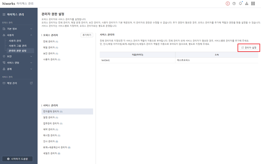 3. [사용자 > 관리자 권한 설정] 에서 오피스 관리자 및 서비스별 관리자를 설정합니다.