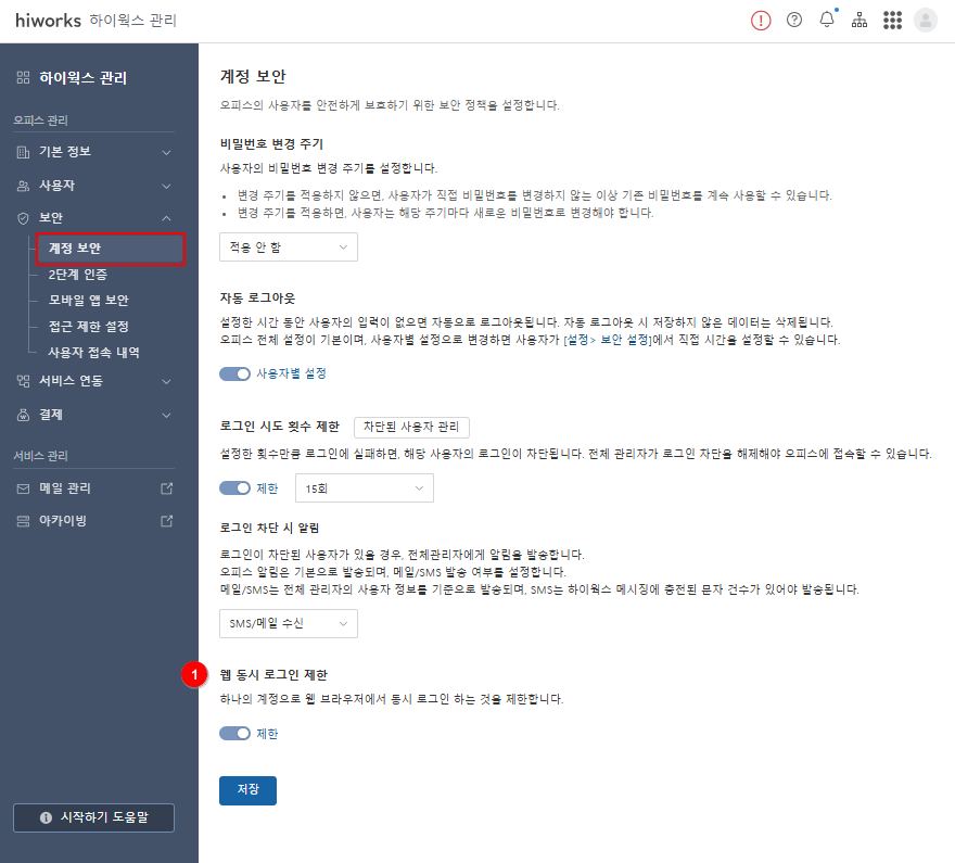 하이웍스 관리에서 웹 동시 로그인 제한 기본 설정 값은 제한 안 함입니다.