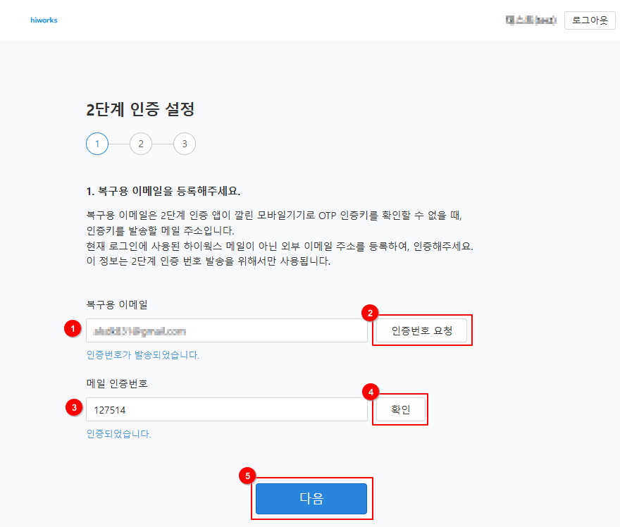 2.2) 사용자는 2단계 인증 설정을 위해 복구용 이메일을 등록해주세요.