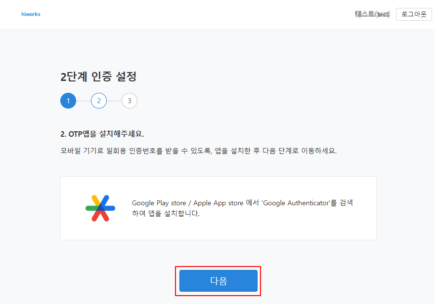 2.3) 2단계 인증 설정을 위해 OTP 앱 설치 안내를 확인하고 [다음]을 클릭합니다.